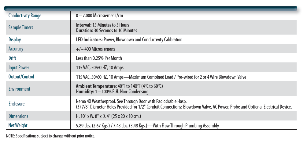 Adjustable interval timer (1/4 – 3 hours) periodically opens an electric valve to sample boiler water conductivity.